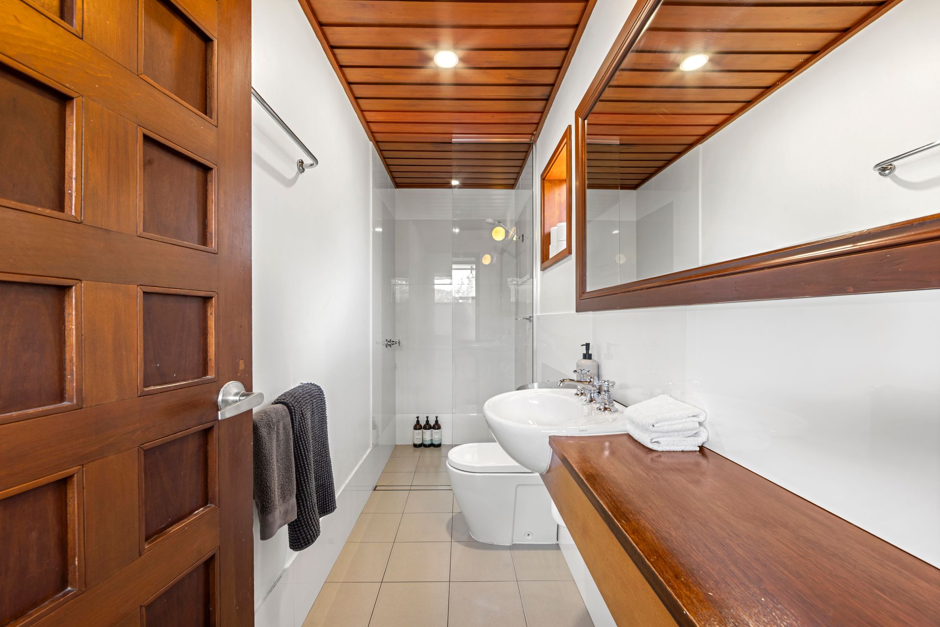 Bedroom 1 (Upstairs): Queen bed, ensuite, lounge, and balcony with bay views