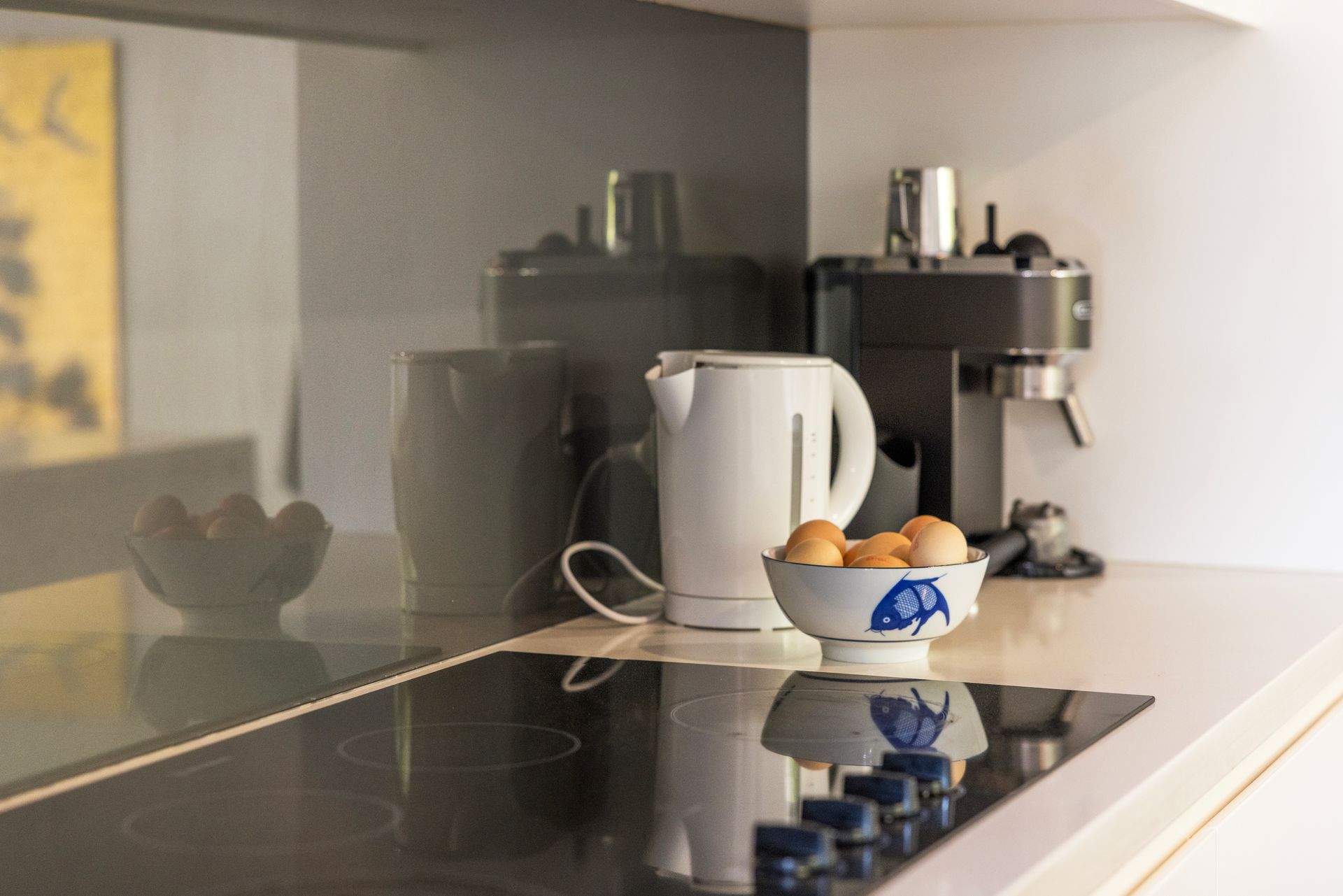 Fully equipped kitchen with oven, cooktop, microwave, dishwasher, fridge, and coffee machine
