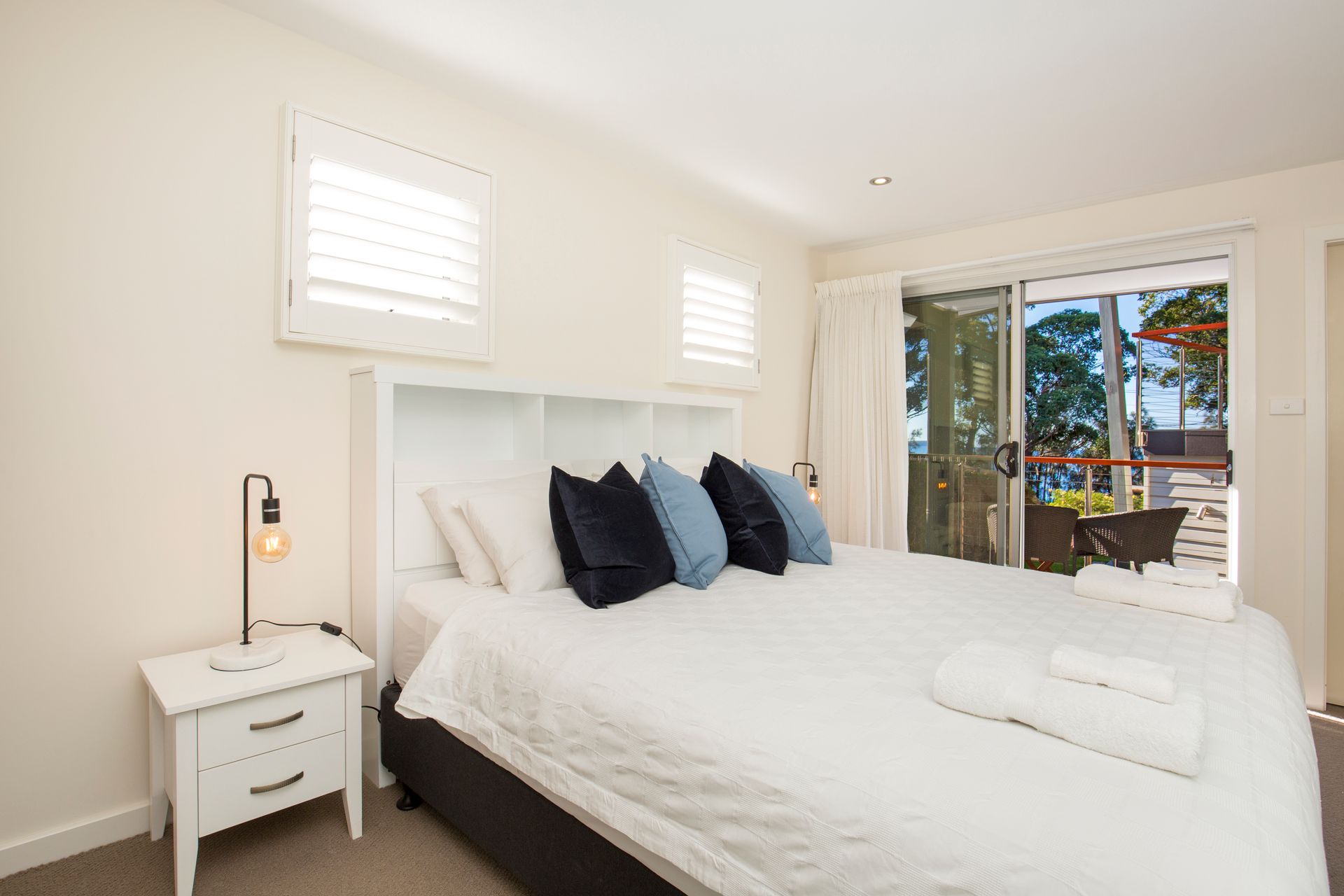 Bedroom 1: (Upstairs) King bed, Built-in robe, Ceiling fan, Filtered water views from balcony