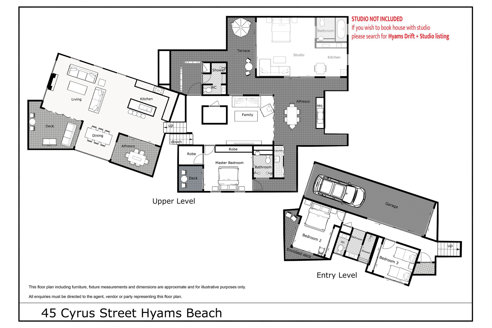 N O T E: The floor plan shows the studio and the house. The Studio is only included when booking through the Hyams Drift plus studio listing